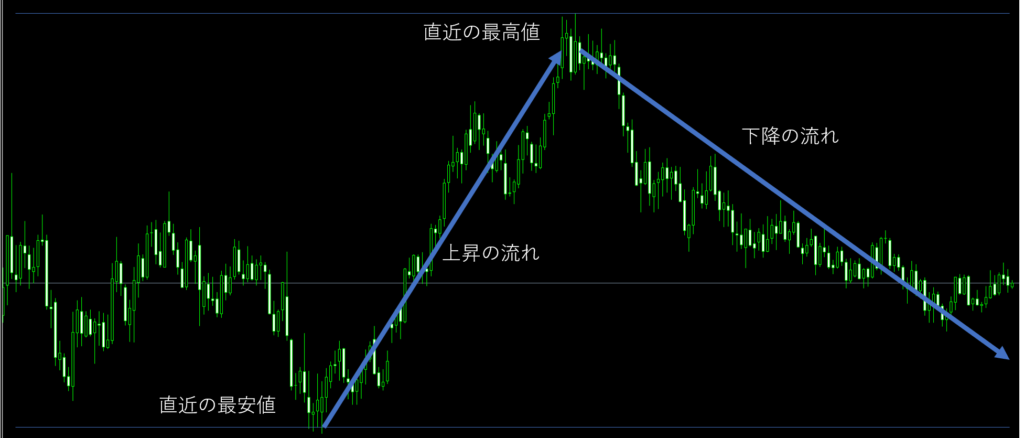 大雑把にとらえると、上昇の流れと下降の流れが見えると思います。実際にこの流れに乗って利益を出すためにはそれなりの知識と経験が必要になりますが、チャートを見ることでこのように予測が可能になってくるわけです。