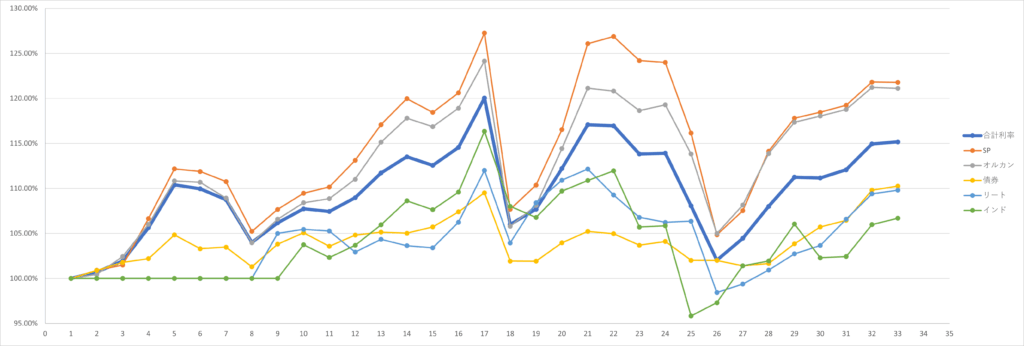 世間では高値更新打何打言っていたと思いますが、割合としてはほぼ変わってないですね。つまり、期間に対して同じ程度の成長という事でしょう。すんわち、お金は増えています。