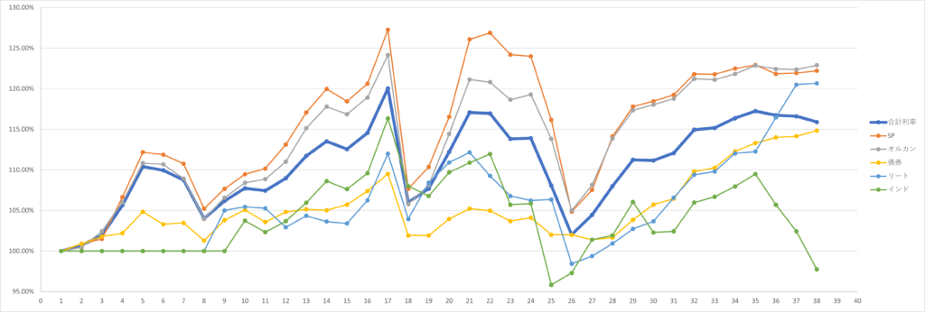 アメリカが結局横ばい、リートも横ばい、国債が微増、インド続落。結果微減って感じですね。インドはこれでも戻ったほうなので、一時的にはものすごく下げてました。停戦合意で戻ってきた感じ。